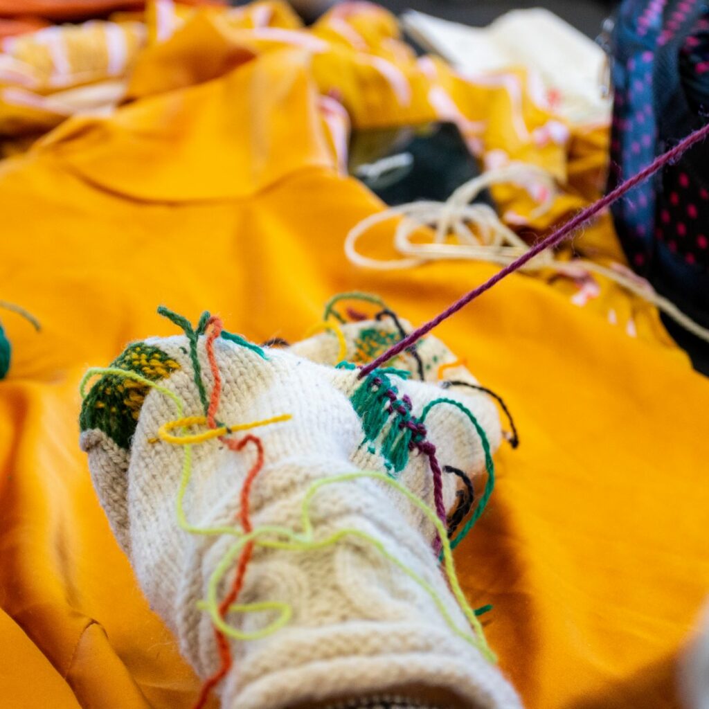 Töövahendid on kohapeal olemas. Osalejal palume võimalusel kaasa võtta mõni auklik, kulunud või või plekiline silmkoeline ese. Näiteks kampsun, sall, sokid, müts või kindad.